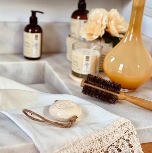 PASTILLA DE JABÓN CON PARTÍCULAS DE AVENA, SUAVEMENTE PERFUMADA, CON AGARRADERA DE HILO DE YUTE/ PESO 95GR