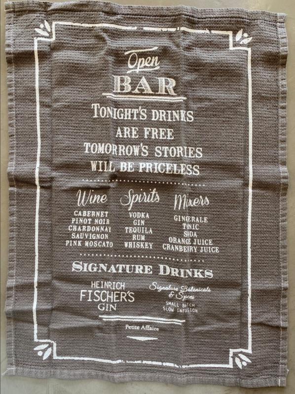 PAÑO DE BAR, ACOMPAÑADO POR 1 BLOCK DE 20 POSAVASOS C/U EN CARTULINA KRAFT Y 1 DESTAPADOR/ ESTAMPADO MANUALMENTE CON SERIGRAFÍA 100% ALGODON