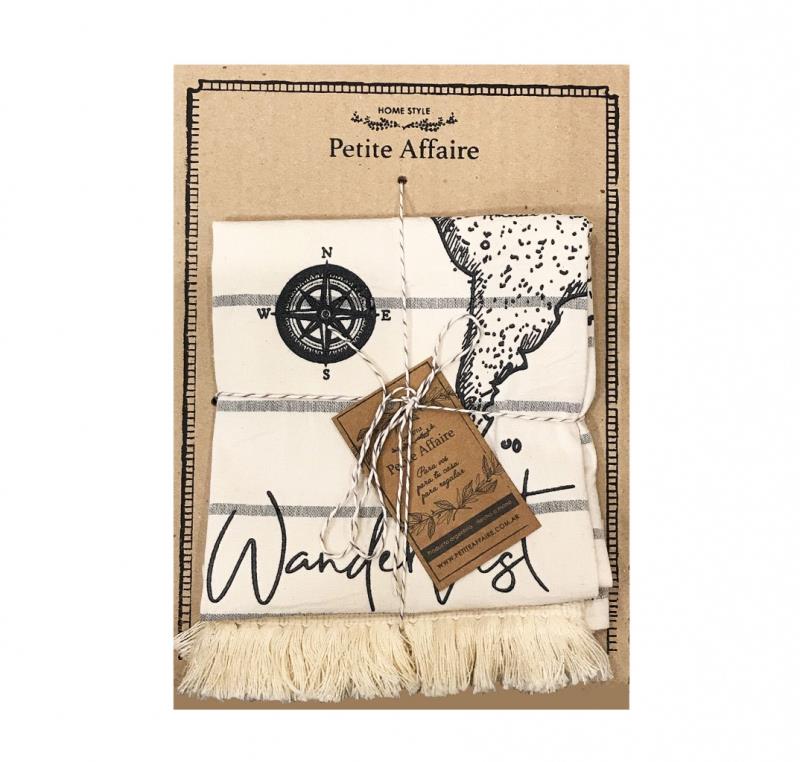 PAÑO DE LIENZO DE ALGODÓN RAYADO GRIS CON ESTAMPA SERIGRÁFICA MANUAL EN TINTA ENGOMADA GRIS Y DETALLE DE FLECOS DE ALGODÓN.