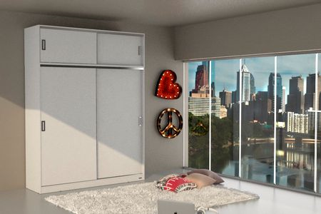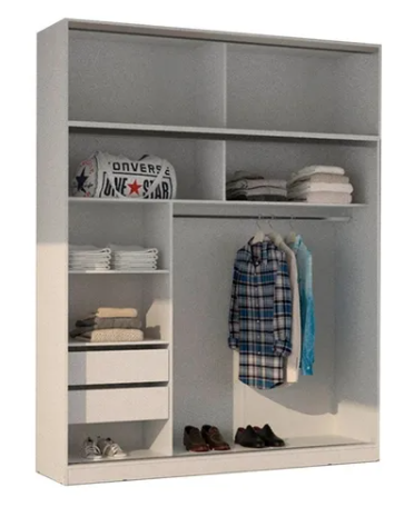 MUEBLE DE MELAMINA CON 2 PUERTAS CORREDIZAS SOBRE GUÍAS INFERIOR Y SUPERIOR DE ALUMINIO CON RUEDAS AJUSTABLES Y PERFILES DE ALUMINIO/ 2 CAJONES CON CORREDERAS METÁLICAS, 4 ESTANTES Y ESPACIO DE COLGADO CON BARRAL DE ALUMINIO Y ESTANTE SUPERIOR/ BAULERA CON 2 PUERTAS CORREDIZAS