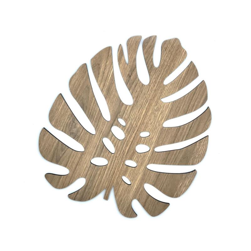 DISPONIBLE 1 MANDALA, 1 MONSTERA/POSAFUENTES EN MELAMINA DE 3 MM TERMINACIÓN TEC CON CALADO EN FORMA DE MANDALA/HOJA MONSTERA EN MELAMINA DE 0,5 MM TERMINACIÓN MADERA OLMO