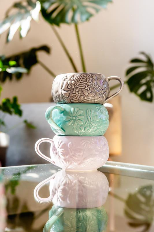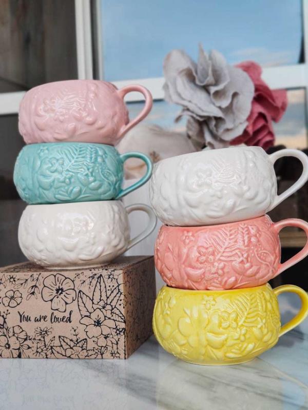 COLORES DISPONIBLES:3 GRIS, 6 ROSA, 4 VERDE AQUA, 2 CORAL,1 NATURAL, 3 LILA, 4 AMARILLO / TAZON DE 500 ML/ DE CERAMICA ESMALTADA/ ESTE PRODUCTO VIENE CONTENIDO EN SU PACKAGING: CAJA DE CARTON FLOREADO